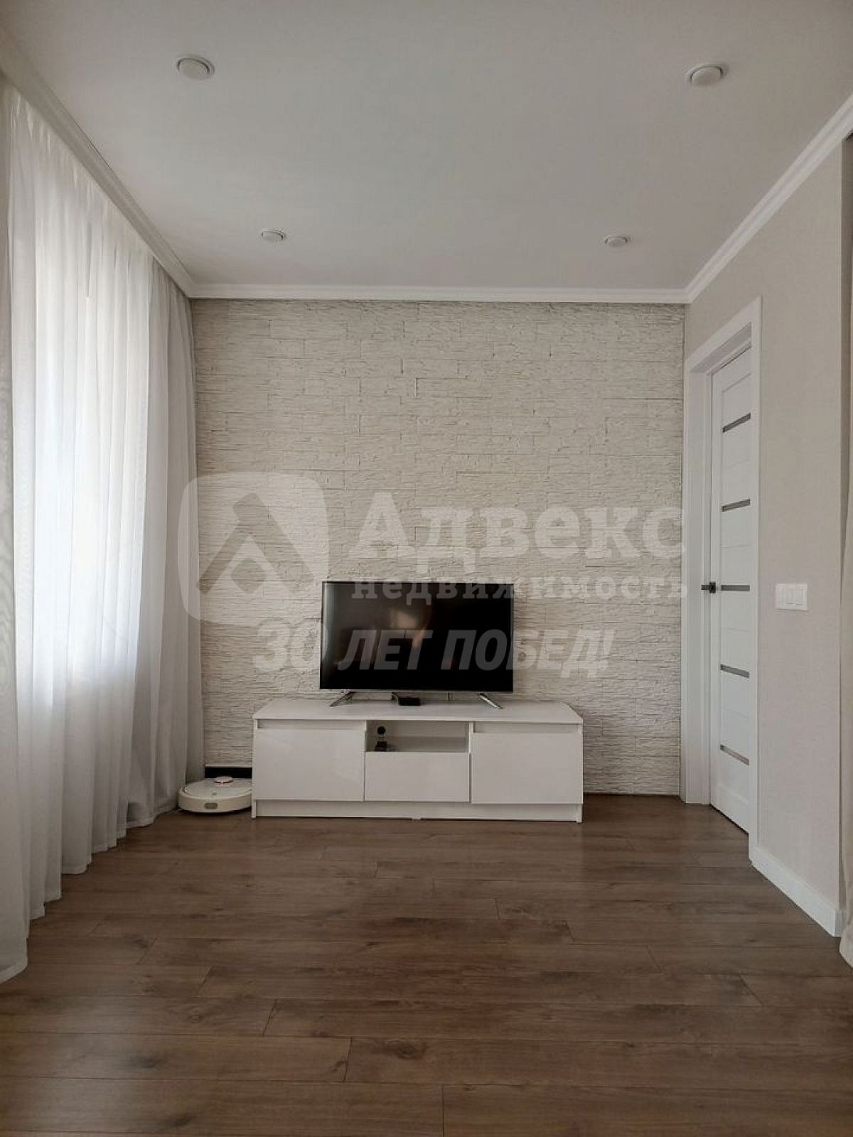 Стены: Выровнены по маякам, с безупречно ровными углами. Оклеены стильными обоями в нейтральных тонах (серый и бежевый), создающими светлую и гармоничную атмосферу.
