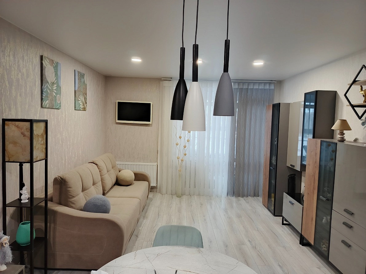 Квартира формата 1+ в новом доме ЖК Андерсен парк. Качественный, современный ремонт в стиле лофт, дорогостоящие материалы, немецкая сантехник (смесители). Кухня -гостиная, спальня.