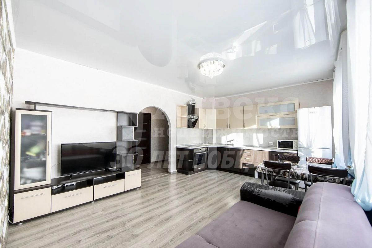 Светлая квартира с удобной планировкой: просторная кухня‑гостиная и отдельная спальня. Практически вся мебель и техника остаются: холодильник, кухонная мебель, кондиционер, стиральная машина, кровать, диван, шкаф.
