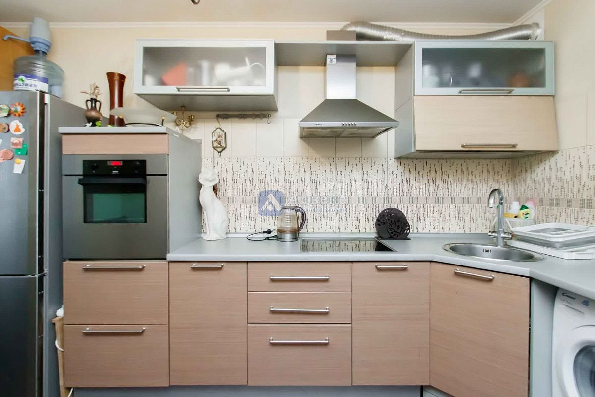 Остается кухонный гарнитур с бытовой техникой, комплект мебели в прихожей, мебель в гостиной.