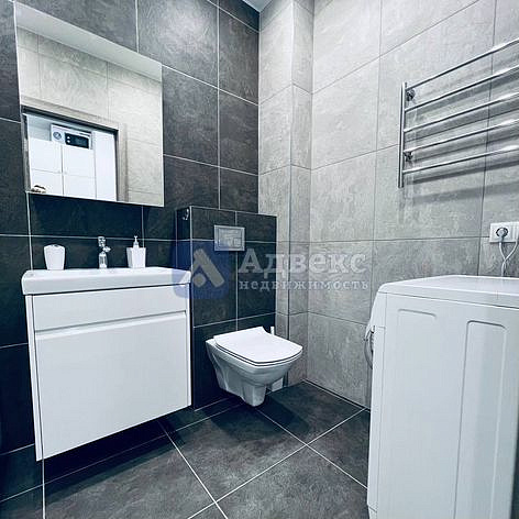 Совмещенный санузел выполнен в современном стиле с качественной отделкой. Из окон открывается вид на закрытую территорию двора, где оборудованы детская и спортивная площадки. Для удобства жителей в доме работают пассажирский и грузовой лифты, а также имеется подземная парковка.