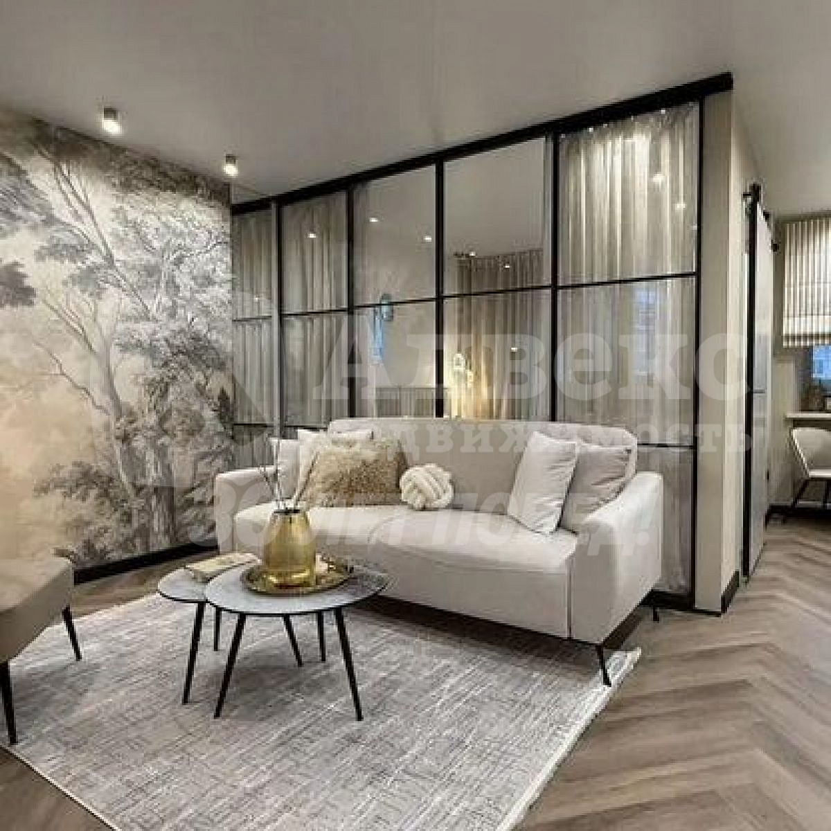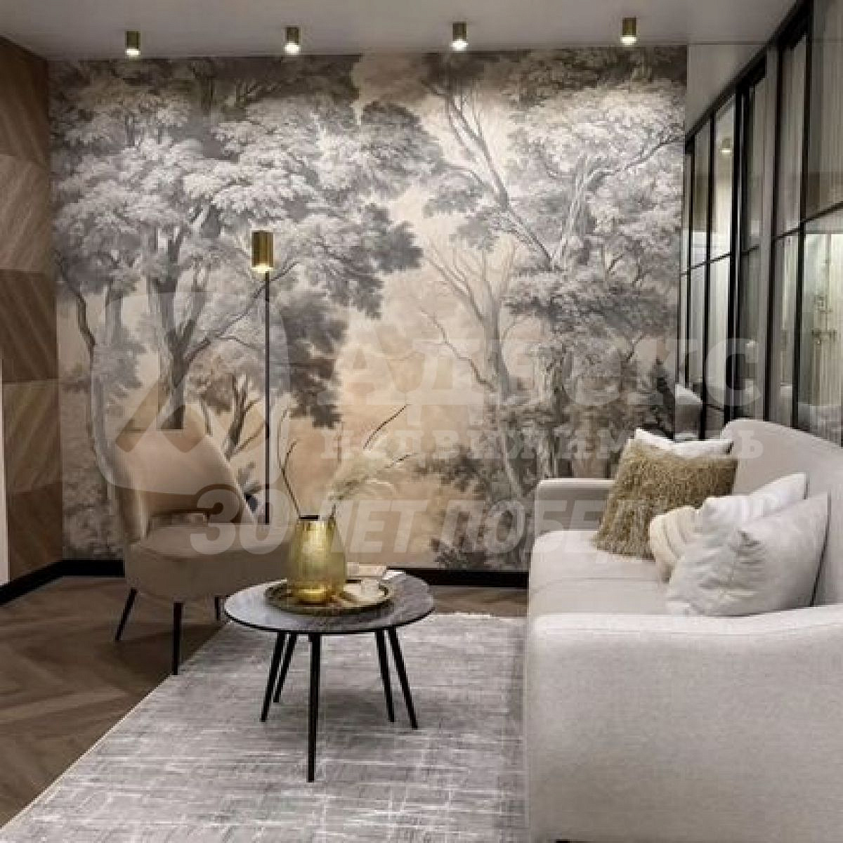 Детали интерьера: Изысканная золотая фурнитура, декоративные элементы (элегантные полоски) и эффектная фреска с пейзажем на стене создают неповторимую атмосферу.