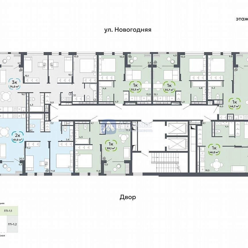 В проекте широкий выбор квартир: площадью от 34 до 74 м2, с мастер-спальнями, постирочными, просторными кухнями-гостиными, двумя санузлами, с окнами в ванной.