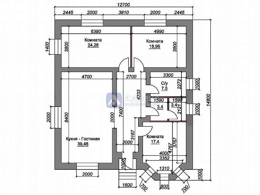 Большая кухня-гостинная и три изолированные комнаты. Одна комната осталась свободная под детскую. Возможно реализовать в ней любые пожелания по мебели. В спальне окна-эркер.