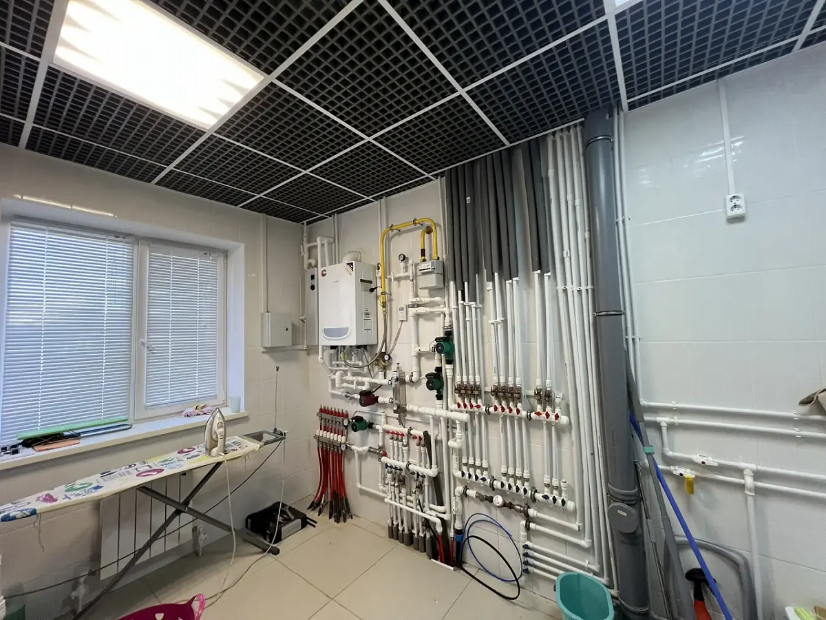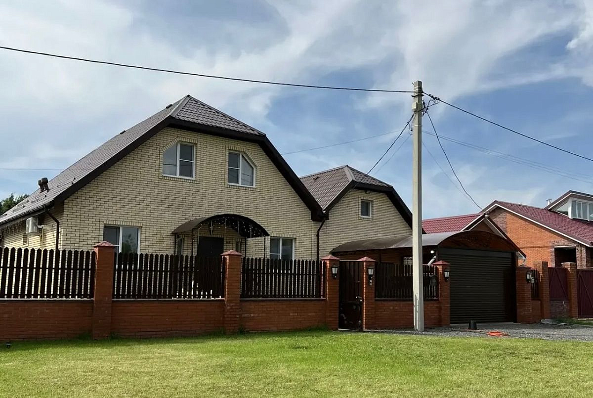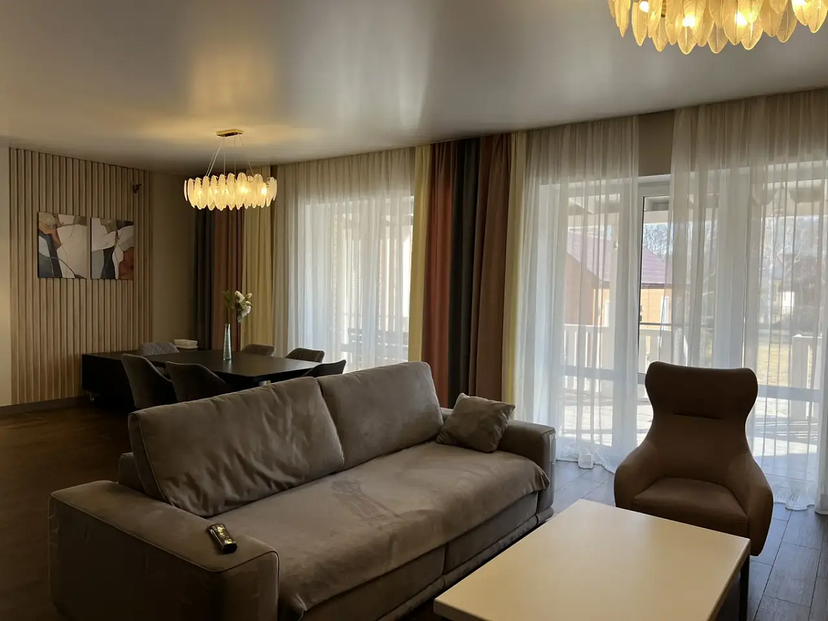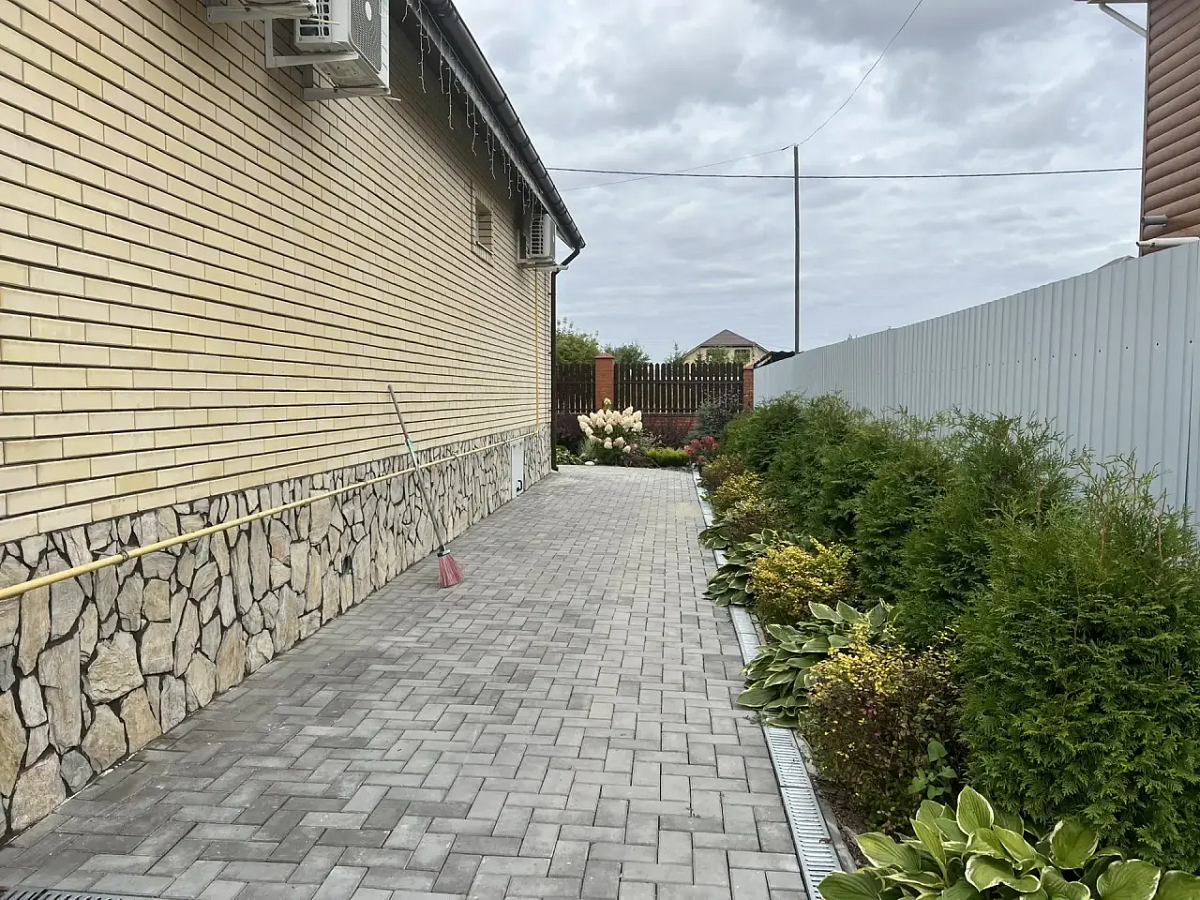 На первом этаже дома холл, санузел, просторная кухня-гостиная, вход в гостевой дом (спальня и кухня-гостиная, санузел), выход на террасу. Второй этаж - 3 спальни, санузел. 4я комната не использовалась, кладовая (гардеробная). Все комнаты оборудованы кондиционерами и климат-контролем. Продуманы световые сценарии как в доме, так и на участке.