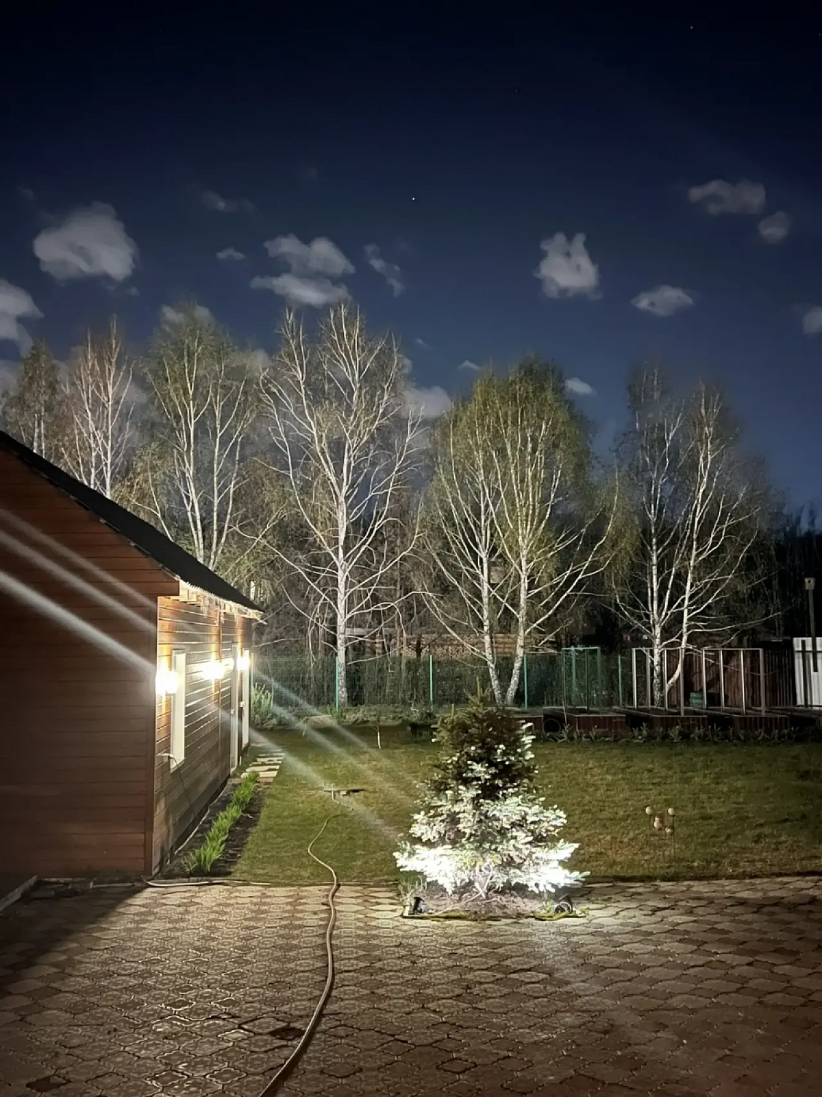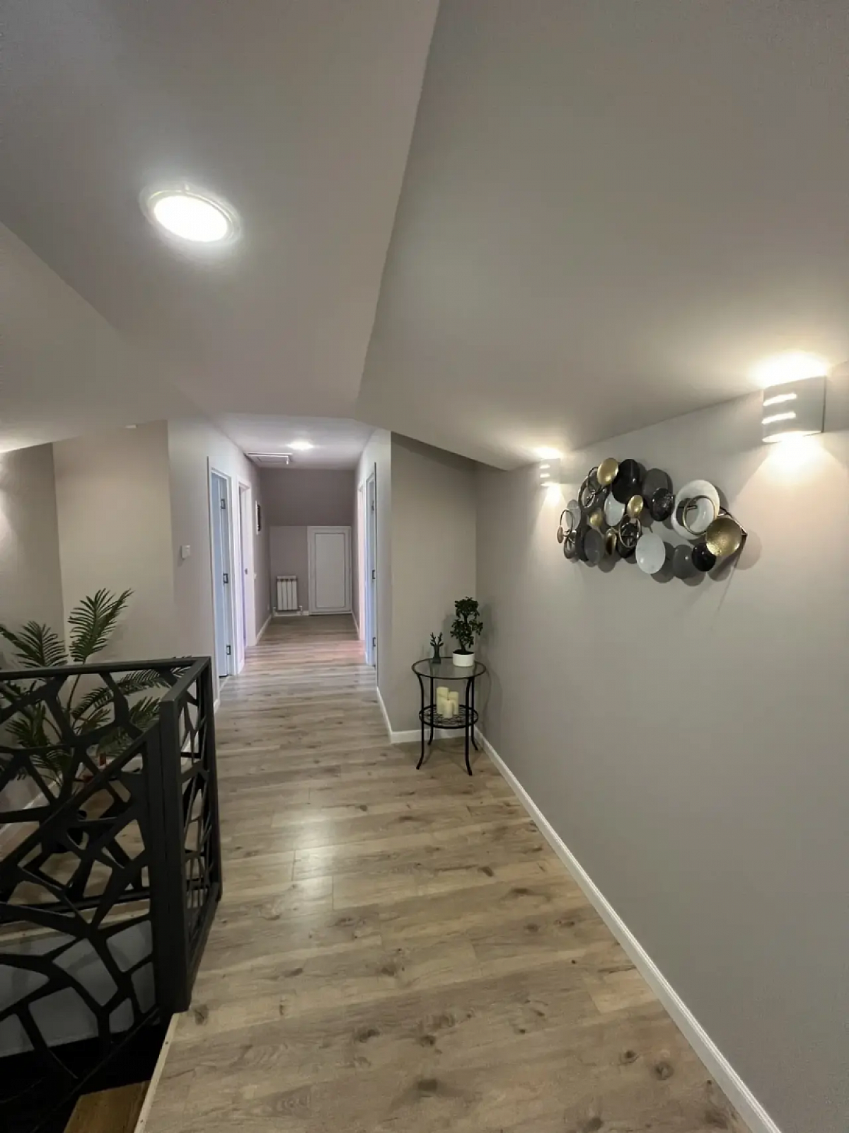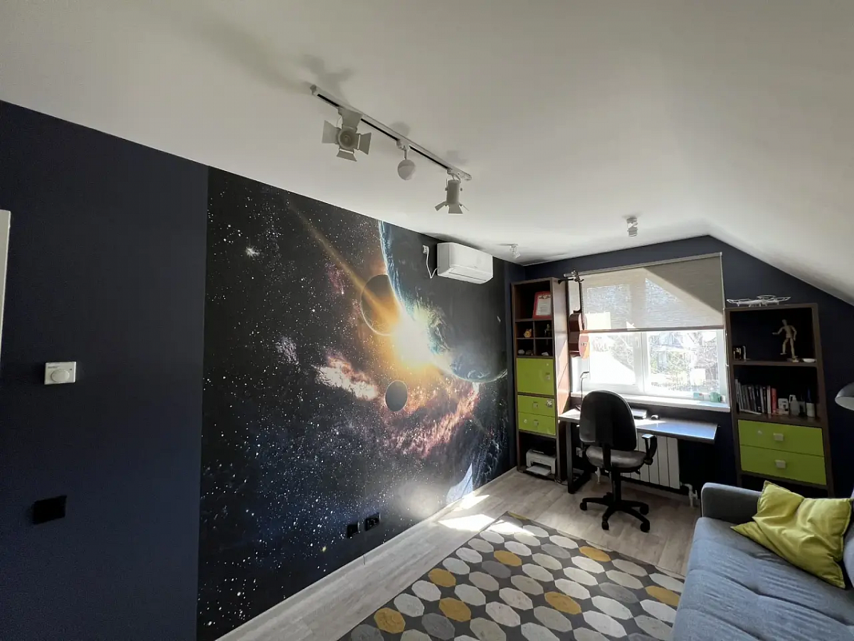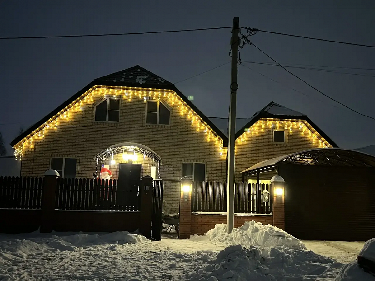 На первом этаже дома холл, санузел, просторная кухня-гостиная, вход в гостевой дом (спальня и кухня-гостиная, санузел), выход на террасу. Второй этаж - 3 спальни, санузел. 4я комната не использовалась, кладовая (гардеробная). Все комнаты оборудованы кондиционерами и климат-контролем. Продуманы световые сценарии как в доме, так и на участке.
