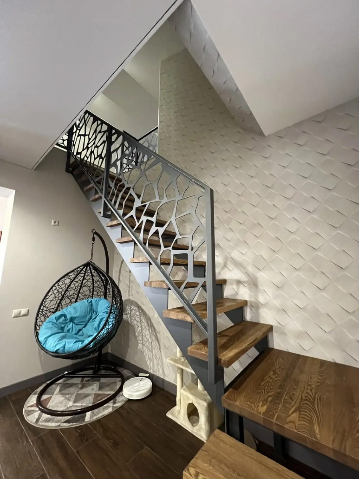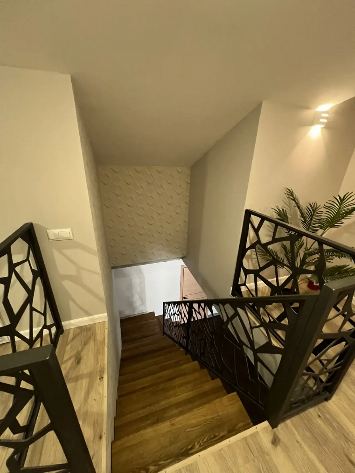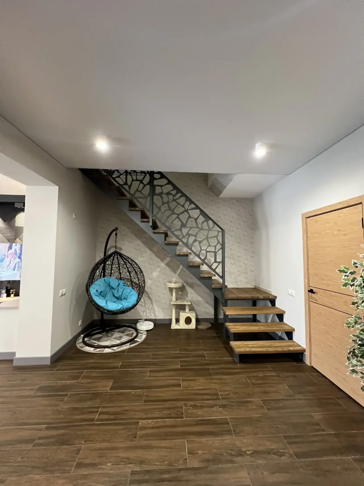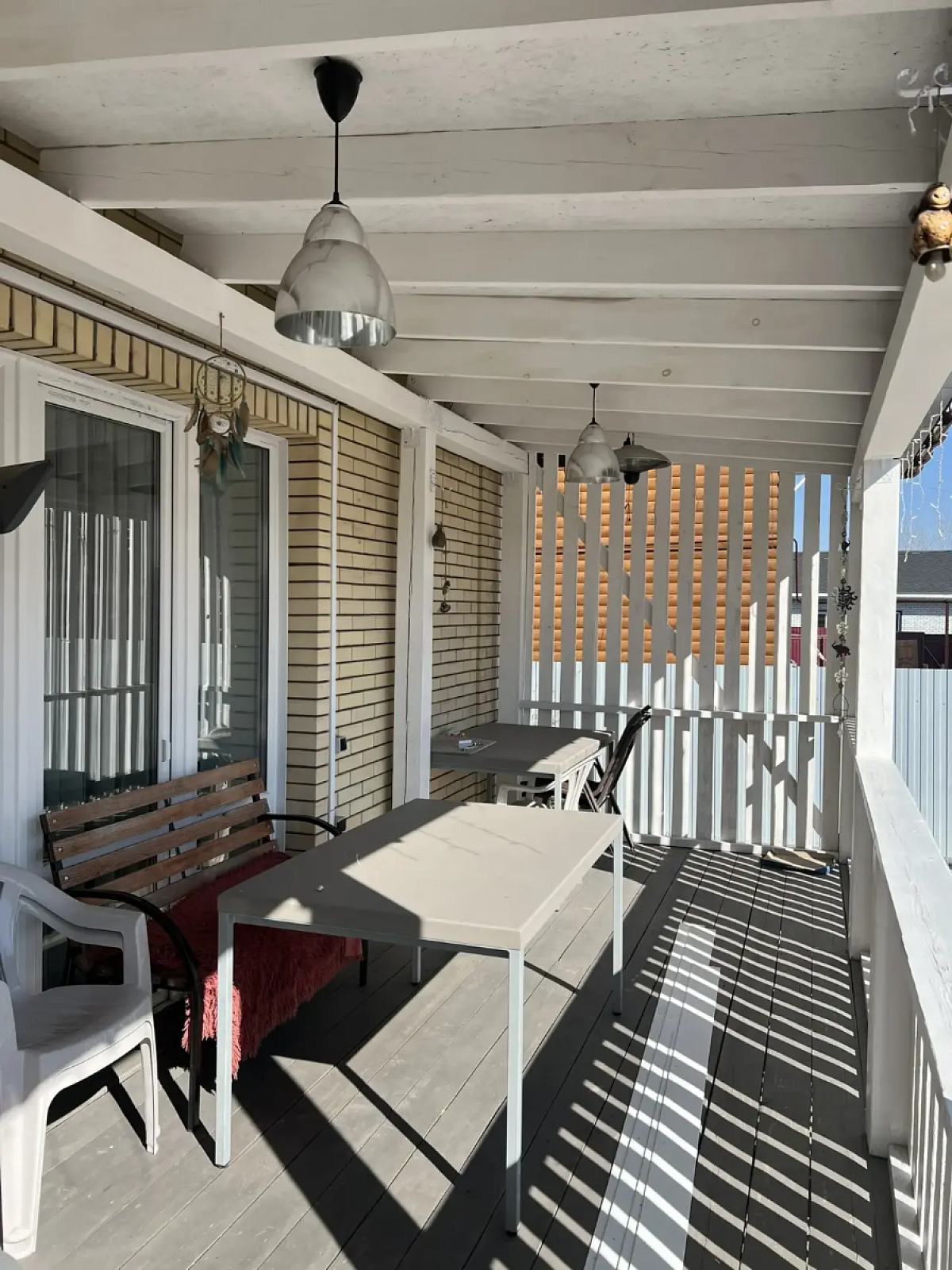 На первом этаже дома холл, санузел, просторная кухня-гостиная, вход в гостевой дом (спальня и кухня-гостиная, санузел), выход на террасу. Второй этаж - 3 спальни, санузел. 4я комната не использовалась, кладовая (гардеробная). Все комнаты оборудованы кондиционерами и климат-контролем. Продуманы световые сценарии как в доме, так и на участке.