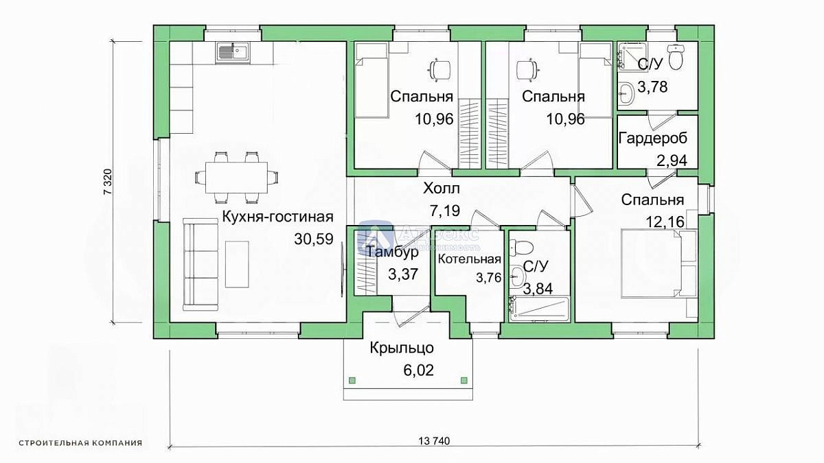 Войдя в дом, вы окажетесь в аккуратном тамбуре, который ведет в просторную кухню-гостиную – настоящее сердце вашего будущего дома, идеальное место для семейных ужинов и теплых вечеров. В доме два санузла и три уютные, изолированные спальни. Особое внимание уделено мастер-спальне: она оборудована вместительной гардеробной и собственной ванной комнатой, что обеспечивает приватность и комфорт для хозяев.