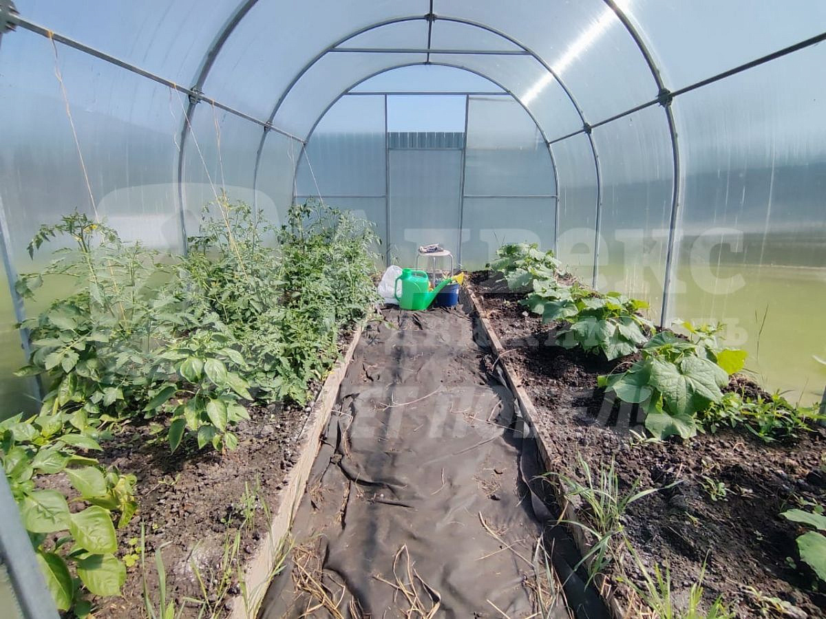 На участке гортензии, ёлки, ива, клён и иные насаждения, есть теплица сарай, начали строить беседку.